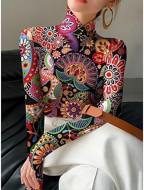 Pentru femei Tunică Floral Elegant Boemia Epocă Manșon Lung Guler Pe Gât Gât Înalt Topuri obișnuite Ieșire Negru Fucsia Trifoi Toamnă Iarnă