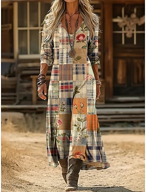 Pentru femei Rochie Maxi lungă Rochie Boho Rochie de epoca Rochie casual Epocă Zilnic În aer liber Vacanță Potrivire Largă Floral Manșon Lung În V Trifoi Primăvară Toamnă