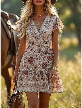 Pentru femei Rochie mini Rochie Boho Rochie casual Rochie florala Elegant Modă Modern În aer liber Vacanță Ieșire Fit regulat Floare Manșon scurt În V Roz Îmbujorat Roșu-aprins Vișiniu Bleumarin Var