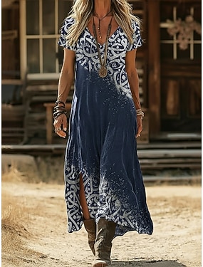 Pentru femei Rochie Maxi Rochie Boho Rochie casual Rochie A line Rochie imprimata Epocă În aer liber Vacanță Sfârșit de săptămână Fit regulat Floral Grafic Manșon scurt În V Bleumarin Mov Trifoi Var