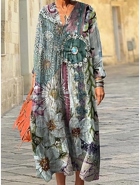 Rochie midi de damă cu decolteu în V mâneci lungi kaftan ușoară lejeră rochie A-line casual boho petrecere ieșiri grafică florală grafică geometrică mâneci lungi decolteu în V roșie albastră curcubeu