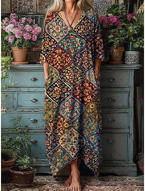 Pentru femei Rochie Maxi lungă Rochie Boho Rochie de epoca Rochie casual Epocă Zilnic În aer liber Vacanță Potrivire Largă Floral Manșon Lung În V Trifoi Primăvară Toamnă