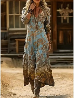 Pentru femei Rochie Maxi lungă Rochie Boho Rochie de epoca Rochie casual Epocă Zilnic În aer liber Vacanță Potrivire Largă Floral Manșon Lung În V Trifoi Primăvară Toamnă