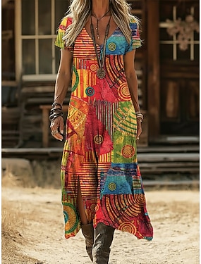 Pentru femei Rochie Maxi Rochie Boho Rochie casual Rochie A line Rochie imprimata Epocă În aer liber Vacanță Sfârșit de săptămână Potrivire Largă Grafic Bloc Culoare Manșon scurt În V Mov Var