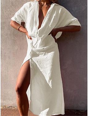 Pentru femei Rochie Maxi lungă In din bumbac artificial Rochii Tip Cămașă Rochii de Caftan Rochie albă De Bază Modern Zilnic Sfârșit de săptămână Potrivire Largă Simplu Manșon Jumate Guler Cămașă Alb