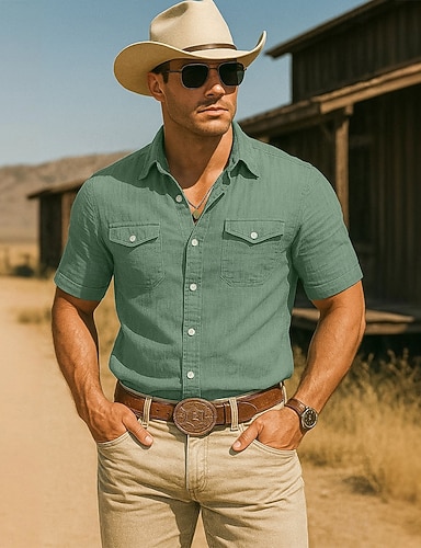 Bărbați Cămașă Cămașă de in Camașă cu nasturi Culoare solidă În aer liber Vacanță Negru Alb Verde Deschis Verde Închis Manșon scurt Guler Cămașă Vară Primăvară Îmbrăcăminte Buzunar