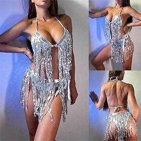 Îmbrăcăminte de dans Samba Costum format din 2 piese cu paiete argintii strălucitoare pentru femei - Set top bralette și fustă pentru petreceri rave