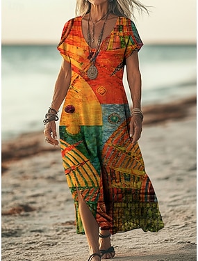 Pentru femei Rochie Maxi lungă Rochie Boho Rochie casual Rochie A line Rochie imprimata Epocă În aer liber Vacanță Sfârșit de săptămână Fit regulat Grafic Geometric Manșon scurt În V Curcubeu Var