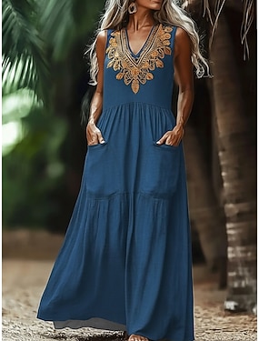Pentru femei Rochie Lunga Rochie Maxi Rochie Boho Rochie de epoca Rochie casual Epocă Concediu Potrivire Largă Floral Fără manșon În V Albastru piscină Roșu-aprins Bej Vară Primăvară