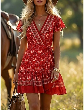 Pentru femei Rochie mini Rochie Boho Rochie casual Rochie florala Elegant Modă Modern În aer liber Vacanță Ieșire Fit regulat Floare Manșon scurt În V Roz Îmbujorat Roșu-aprins Vișiniu Bleumarin Var