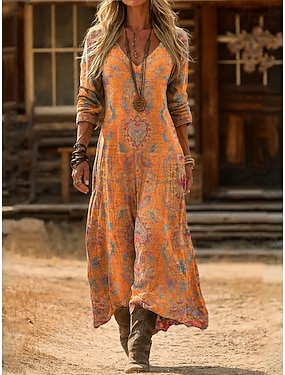 Pentru femei Rochie Maxi lungă Rochie Boho Rochie de epoca Rochie casual Epocă Zilnic În aer liber Vacanță Fit regulat Floral Manșon Lung În V Portocaliu Primăvară Toamnă