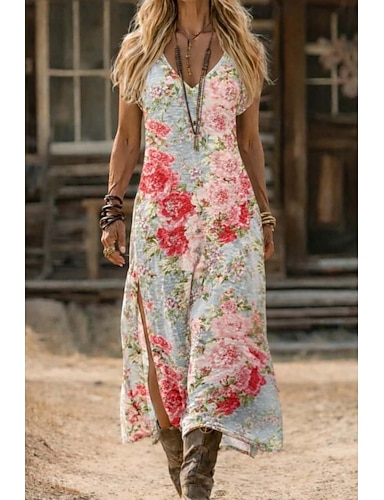 Pentru femei Rochie Maxi Rochie de Vară Rochie A line Vacanță Casual Boho Plajă Ieșire Fit regulat Floral Grafic Fără manșon În V Albastru piscină Roz Îmbujorat Vară Primăvară