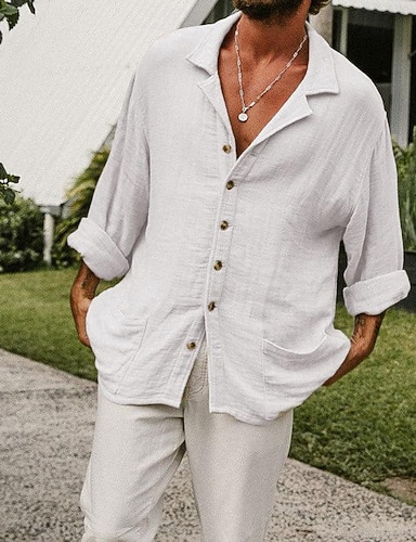 Bărbați Cămașă Cămașă de in Cămașă albă din bumbac Cămașă casual Cămașă din bumbac și in Cămașă din bumbac Simplu Vacanță Hawaiian Alb Caisă Manșon Lung Guler de tabără Primăvara & toamnă Îmbrăcăminte
