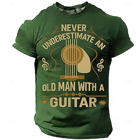 Tricou bărbătesc cu imprimeu de chitară acustică, nu subestima niciodată un bătrân cu o chitară, corzi de chitară, cheie G, note muzicale, vintage retro, iubitor de muzică, grafică, croială regulată,