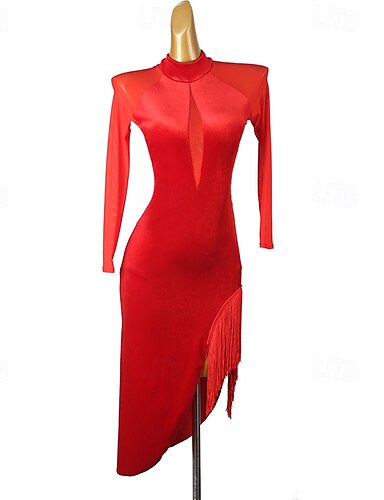 Rochie de dans latino pentru femei, cu mânecă lungă, cu franjuri roșii și strasuri, din plasă, pentru competiții de dans latino