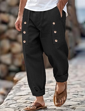 Bărbați Pantaloni de in Pantaloni Pantaloni de vară Nasturi Buzunar frontal Pliuri Simplu Confort Respirabil Lungime totală Casual Zilnic Concediu Modă De Bază Potrivire Largă Negru Alb
