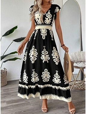 Pentru femei Rochie Maxi Rochie Boho Rochie de epoca Rochie casual Elegant Modă Modern În aer liber Plajă Vacanță Fit regulat Grafic Manșon scurt În V Negru Galben Bleumarin Trifoi Vară Primăvară