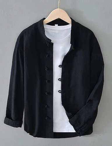 Bărbați Cămașă Cămașă de in Cămașă de vară Costum de plajă Cămașă cu guler bandă Cămașă cu guler de bunic Simplu Casual Vacanță Albastru piscină Negru Alb Kaki Manșon Lung Guler mandarin Var