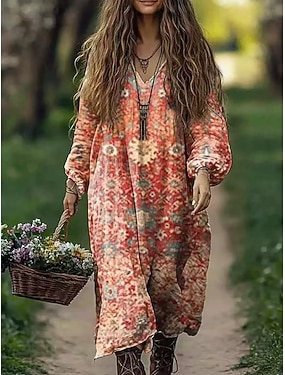 Pentru femei Rochie Maxi lungă Rochie Boho Rochie de epoca Rochie casual Epocă Zilnic În aer liber Vacanță Potrivire Largă Floral Imprimeu Paisley Manșon Lung În V Roz Îmbujorat Portocaliu Primăvar