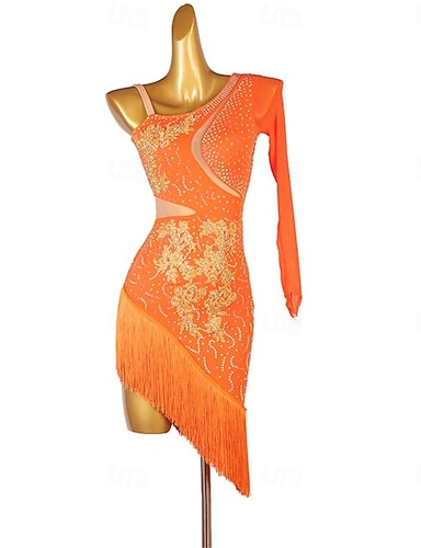 Rochie de dans latino portocalie strălucitoare pentru femei - complet decorată cu strasuri, decolteu în formă de inimă cu bretele subțiri, franjuri &tiv asimetric, include rochie de seară asortată cu