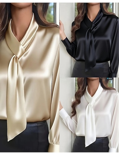 Pentru femei Cămașă din satin Cămașă de Costum Bluză Zdrobit Culoare solidă Elegant Stilat Birou Manșon Lung Gât cravată Gât Înalt Topuri obișnuite Zilnic Birou Muncă Negru Alb Kaki Primăvară Toamn