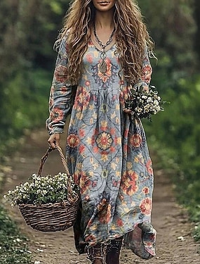 Pentru femei Rochie Maxi lungă Rochie Boho Rochie de epoca Rochie casual Epocă Zilnic În aer liber Vacanță Fit regulat Floral Manșon Lung În V Trifoi Primăvară Toamnă