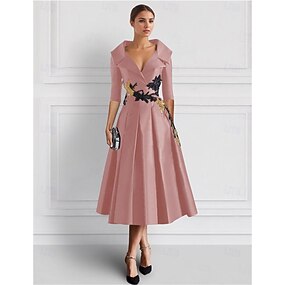 Rochii cocktail A-line brodate Rochie de tuxedo Mamă a Miresei Elegantă Formală Lungime până la gleznă Mâneci 3/4 Guler de cămașă Buzunar din satin cu aplicații