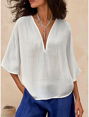 Pentru femei Bluză In din bumbac artificial Culoare solidă Elegant Epocă Stilat Lungime Manșon 3/4 În V Topuri obișnuite Zilnic Concediu Albastru piscină Roșu-aprins Trifoi Kaki Vară Primăvară
