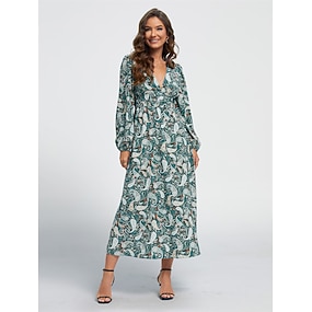 Pentru femei Rochie casual Rochie Maxi lungă Maro Manșon Lung Geometric Imprimare Toamna iarna În U Stil Boem S M L