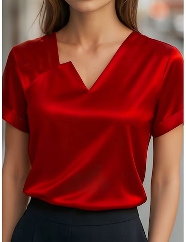 Pentru femei Cămașă Cămașă din satin Bluză Simplu Stilat Clasic Modern Manșon scurt În V Topuri obișnuite Zilnic Concediu Ieșire Negru Roșu-aprins Trifoi Vară Primăvară