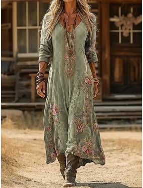 Pentru femei Rochie Maxi lungă Rochie Boho Rochie de epoca Rochie casual Epocă Zilnic În aer liber Vacanță Potrivire Largă Floral Manșon Lung În V Trifoi Primăvară Toamnă
