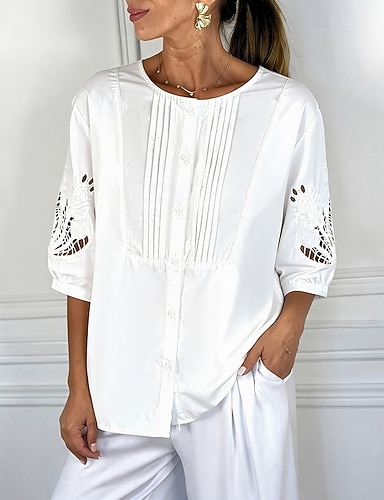 Pentru femei Cămașă casual Camașă cu nasturi Bluză Dantelă Peteci Brodat Culoare solidă Elegant Vacanță Modă Manșon Lung Guler de stand Topuri obișnuite Plajă Concediu Ieșire Alb Vară Primăvar
