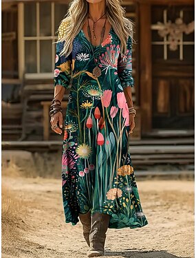 Pentru femei Rochie Maxi lungă Rochie de epoca Rochie casual Epocă Zilnic În aer liber Vacanță Fit regulat Floral Manșon Lung În V Trifoi Primăvară Toamnă