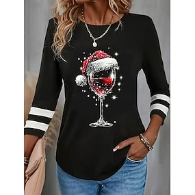Cămașă bluză pentru femei de Crăciun cu pahar de vin casual mâneci lungi guler rotund bluze obișnuite patchwork zilnic negru vin albastru verde toamnă iarnă