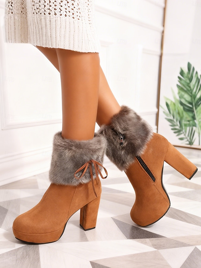 Ghete de damă cu platformă, din blană artificială, din piele întoarsă de culoare cămilă, cu detalii de legături și toc gros - ghete de iarnă călduroase și elegante, pentru purtare zilnică și de sărbători#14548286