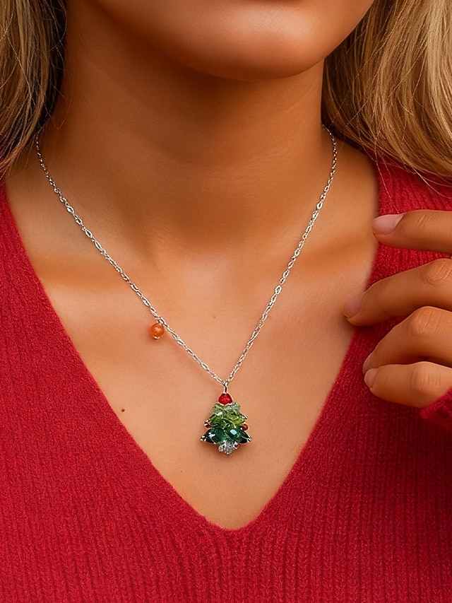 Bijuterii acrilice de Crăciun pentru femei – colier și cercei cu brad festiv și funde roșii, perfecți pentru petreceri și sărbători#14575788