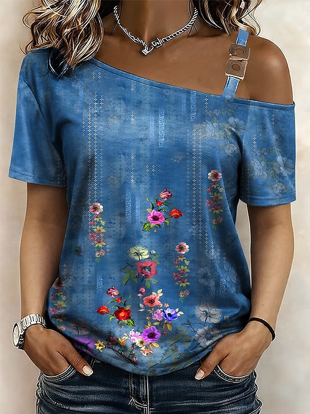 Pentru femei Tricou Tee Top Imprimeu Floral Grafic Stilat Clasic Casual Manșon scurt Gât asimetric Topuri obișnuite Zilnic Ieșire Sfârșit de săptămână Albastru piscină Vară Primăvară #15424324