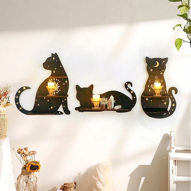 Raft de perete cu siluetă de pisică neagră cu accente aurii – afișaj suspendat din lemn boho pentru cristale, lumânări și decor – suport drăguț montat pe perete cu pisicuță pentru sufragerie, dormitor#15940283