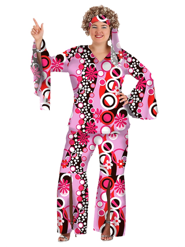 [Material] Confectionat din poliester de înaltă calitate, acest outfit oferă o potrivire confortabilă și elastică, cu microelasticitate, permițând o mișcare ușoară în timpul oricărui eveniment. Materialul are un imprimeu vibrant și psihedelic, cu o combinație de culori roz, roșu, alb și negru, împodobit cu modele captivante, precum cercuri și flori, pentru un vibe cu adevărat retro. [Potrivire] Ansamblul include un top cu mâneci lungi în formă de V și pantaloni cu talie înaltă și picior larg, asigurând o siluetă flatantă și stilată, reminiscentă de moda discotecilor din anii '70. Mânecurile evazate și stilul pantalonilor cu umeri evazați accentuează estetică retro, făcându-l o alegere deosebită pentru ocazii tematice. [Aspecte de Design] Acest set încorporează o fuziune unică de stiluri din anii '60 și '70 cu formele sale îndrăznețe, energice și paleta de culori groovy. Outfit-ul este completat cu o bentiță asortată, care ridică aspectul general și adaugă o notă de nostalgie jucăușă. [Ocazii] Ideal pentru Halloween, carnavaluri, petreceri de masquerade sau orice eveniment tematic axat pe moda retro. Este perfect pentru cei care iubesc să îmbrățișeze stiluri îndrăznețe și jucăușe, fie că este vorba de o petrecere vibrantă sau o întâlnire de seară tematică. [Gama de Mărimi] Disponibil într-o gamă largă de mărimi, inclusiv XL, XXL, 3XL, 4XL și 5XL, acomodând diverse tipuri de corp și asigurând o potrivire confortabilă pentru toți.