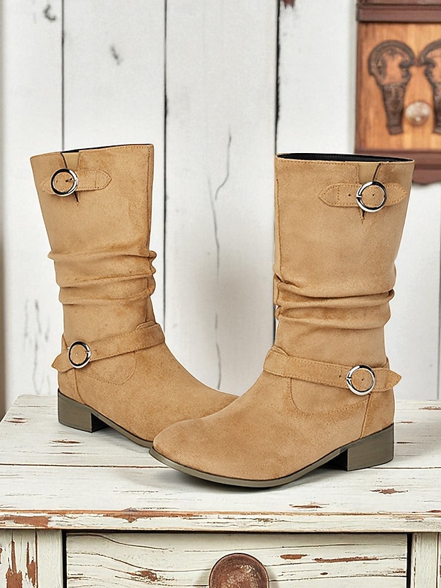 Ghete largi pentru femei cu barete cu cataramă până la jumătatea gambei – ghete de iarnă în stil vintage din piele întoarsă pentru ținute casual și modă de toamnă #9860338