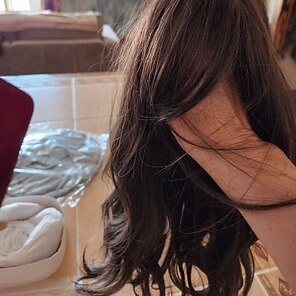 Prietena mea o sa ma ajute sa invat cum sa o pun. Nu am purtat niciodata o peruca inainte. Peruca este frumoasa si moale.