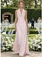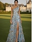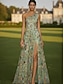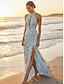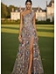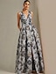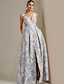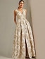 А-силуэт В пол Вечернее платье Вечернее платье С пышной юбкой Торжественное платье Элегантный стиль Высокий раскол Без рукавов V-образный вырез Вечеринка в саду Свадьба Жаккард с Pазрез