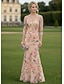 А-силуэт Русалка В пол Вечернее платье Элегантный стиль Винтаж С цветами Длинный рукав Вырез под горло Вечеринка в саду Свадьба Шифон с Цветочный рисунок Оборки
