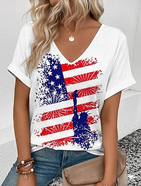 Футболка для женщин на День независимости Патриотическая Флаг Повседневная Красный Белый И Синий Короткий рукав V-образный вырез Обычные топы Повседневные Красный Лето