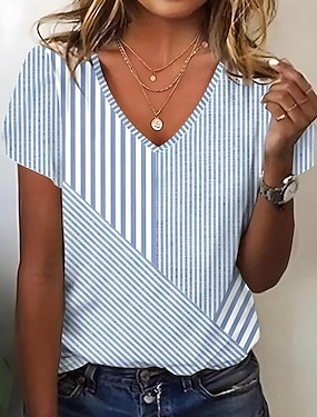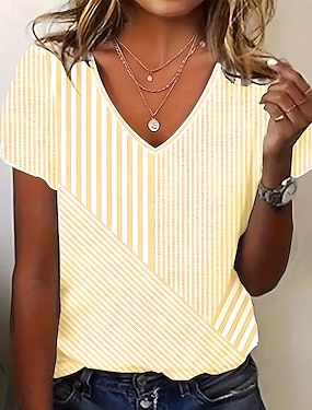 Карнавал Жен. Футболка С принтом Полоски Стиль На каждый день С короткими рукавами V-образный вырез Обычные топы Повседневные Синий Желтый Светло-зеленый Розовый Лиловый Лето Весна