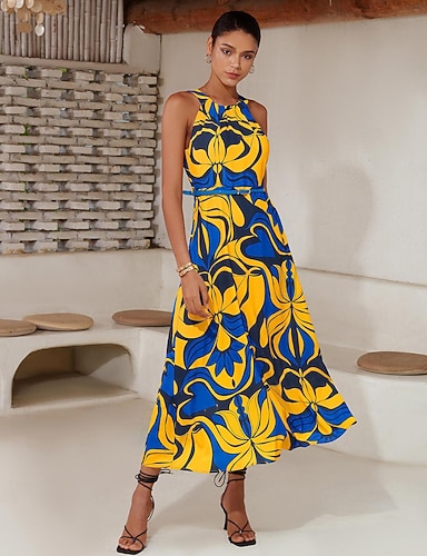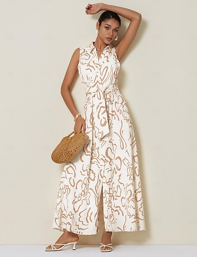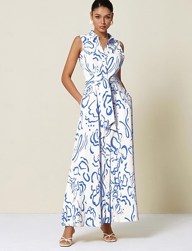 Жен. Платье-рубашка Длинное платье Синий Бежевый Без рукавов Изгибы Карман Рисунок С ремнем Лето Рубашечный воротник А-силуэт XS S M
