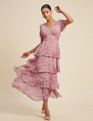 Жен. Платье средней длины Шифоновые платья Элегантный стиль Стиль Рукава буффы Свадьба Свадебный гость Повседневные Стандартный Цветочный принт Рукав до локтя V-образный вырез Розовый Лето Весна Осень