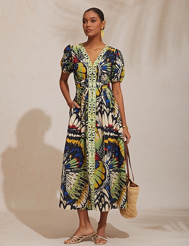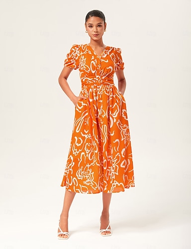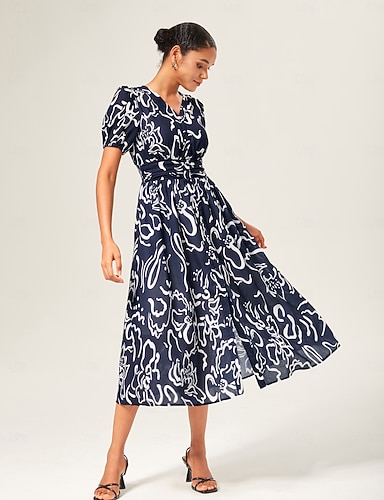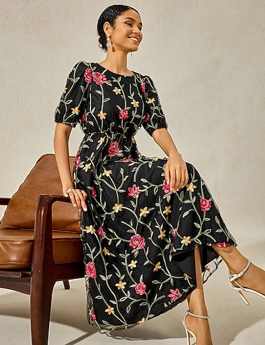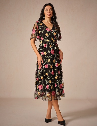 Жен. Платье средней длины Черное платье Элегантный стиль Стиль Для вечеринок Свадебный гость Свидание Свободное облегание Цветочный принт С короткими рукавами V-образный вырез Черный Лето Весна