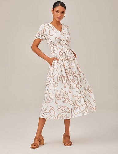 Жен. Мужской Платье с принтом Белый Рукав до локтя Цветочный принт Эластичная талия Рисунок Лето Весна Весна лето Вырез лодочкой Круглый вырез Элегантный стиль Удобный XS S M