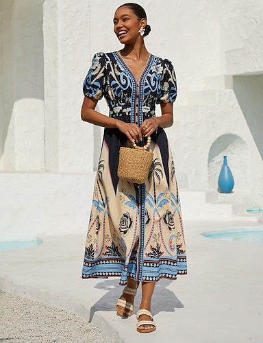 Жен. Длина чая Платье A-силуэта Многослойное платье Элегантный стиль Расклешенный рукав Отпуск Повседневные Свободное облегание Цветочный принт Рукав до локтя V-образный вырез Светло-синий Лето